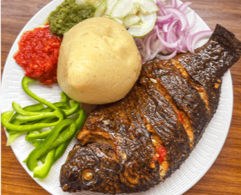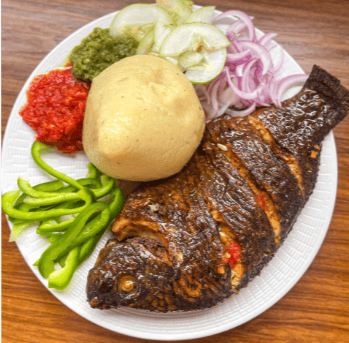 Cooked corn and cassava dough with grilled tilapia and green pepper sauce. | 200czk | prepared on Tuesdays